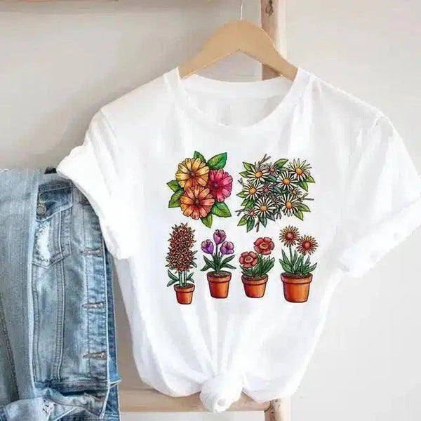Kukkainen ruukkukasvit painettu t-paita rento pukeutuminen