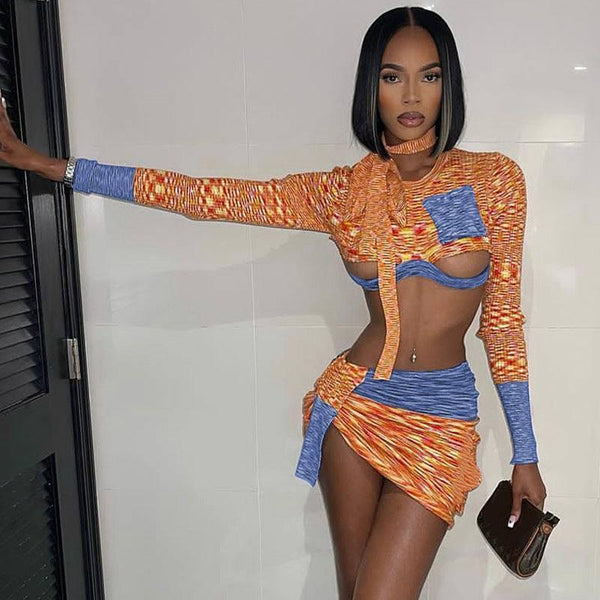 Knitted Long Sleeves Cropped Top Slim Skirt Suit