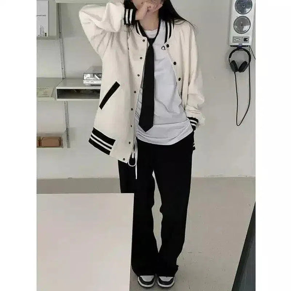 Varsity-takki, jossa on raidalliset hihansuut ja nepparikiinnitys