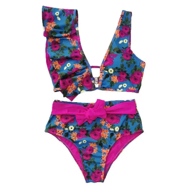 Epäsymmetrinen röyhelöinen korkeavyötäröinen bikinit uimapuku