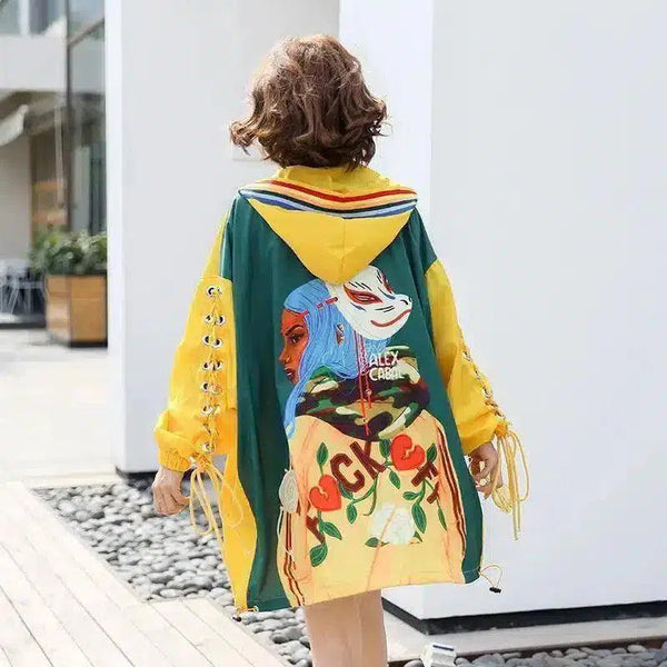 Hupullinen takki graafisella painatuksella ja pitsillä varustetuilla hihoilla