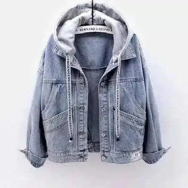 Hupullinen farkkutakki, jossa on nappisuljenta