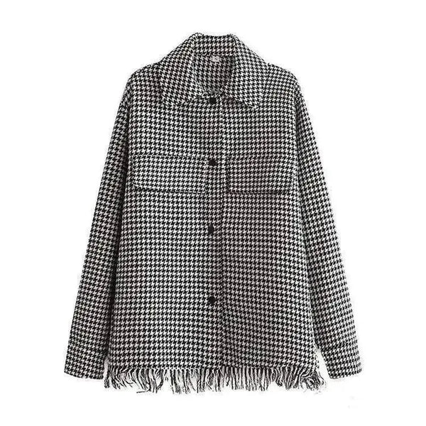 - Suunnittelun yksityiskohdat: Houndstooth-kuvio, jossa hapsut helmassa