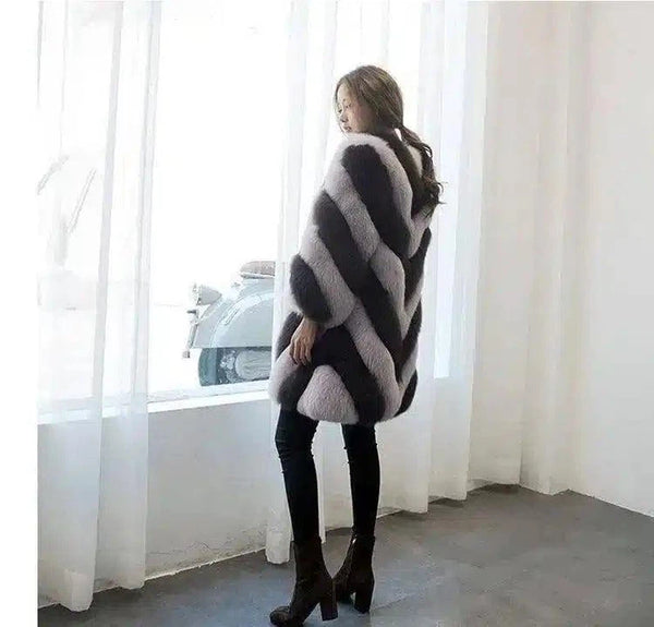 Raidallinen pitkähihainen tekoturkistakki