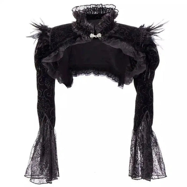 - Kaula-aukko tai olkatyyli: Korkea pitsikaulus höyhenillä koristeltuna