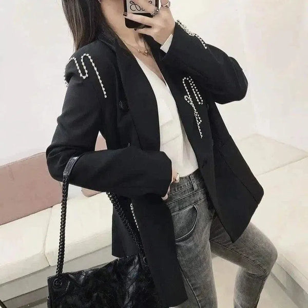 - Rikas muoti-ilmoitus: Tee rohkea lausunto tämän bleiserin silmiinpistävän mustan värin ja kontrastisten helmiäisyksityiskohtien avulla, jotka varmasti erottuvat missä tahansa ympäristössä.