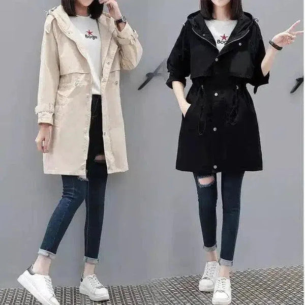 Naisten hupullinen trenssitakki, jossa kiristysnauha vyötäröllä
