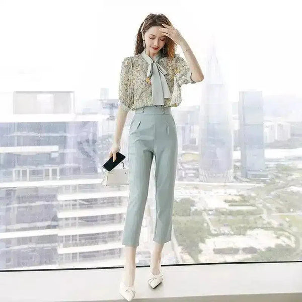 Naisten tyylikäs kravattipusero ja leikatut housut
