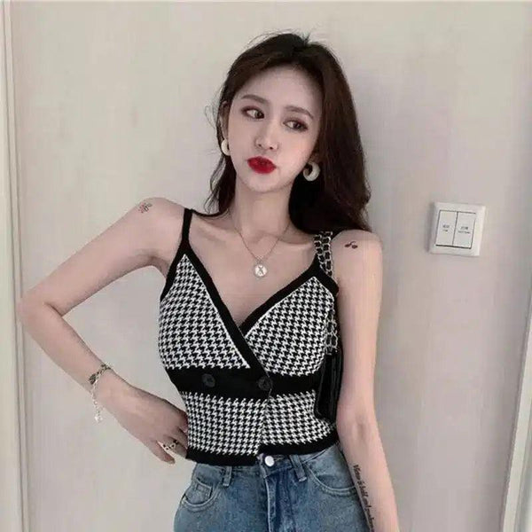 Naisten Houndstooth V-aukkoinen hihaton toppi