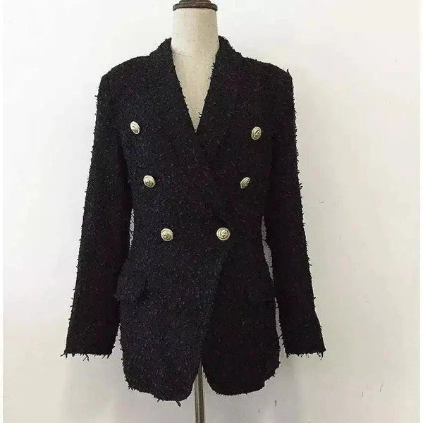 Kaksirivinen kuvioitu bleiseri, jossa on kultaiset napit