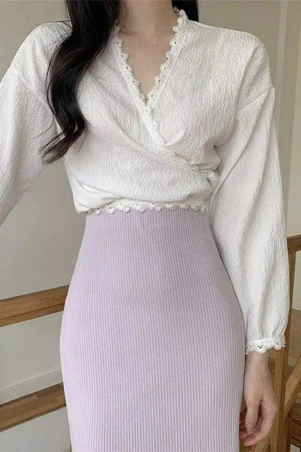 Pitsikoristeinen V-kaula-aukkoinen pusero & neulottu lyijykynähame