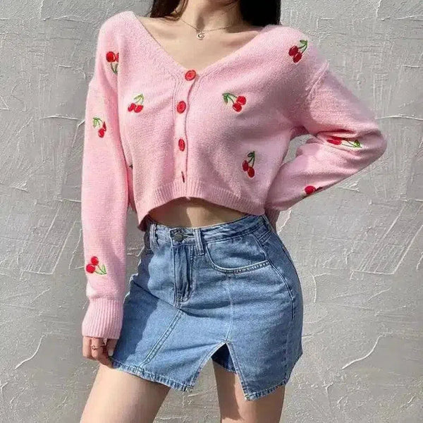 Kirsikka kirjailtu Crop Cardigan kanssa Button-Up edessä