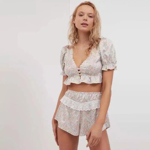 Naisten kukkakuvioinen röyhelöinen Crop Top & shortsit setti