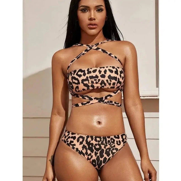 Leopardikuvioinen olkaimeton uimapuku letkuttomalla putkipäällä