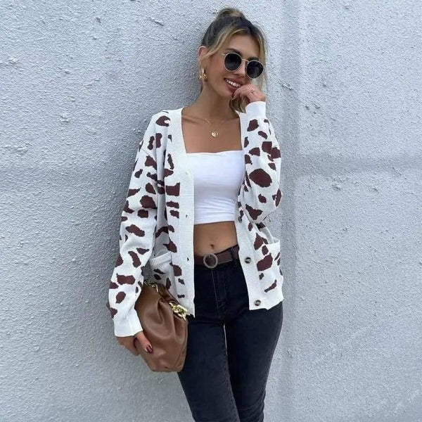 Leopardikuvioinen V-kaula-aukkoinen neulepusero takki