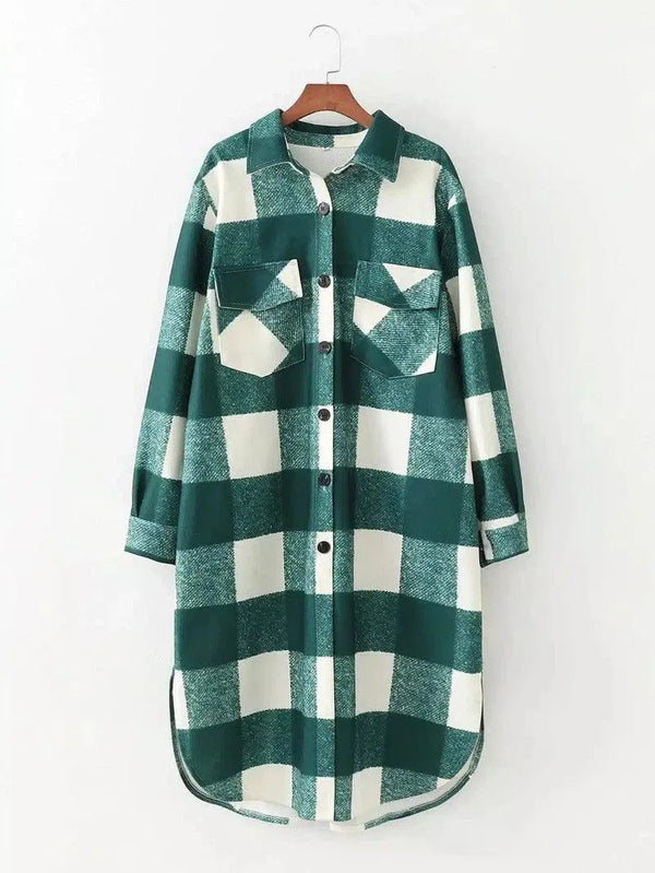 - Suunnittelun yksityiskohdat: Rohkea vihreä-valkoinen ruutukuvio, kaksi rintataskua läpällä, napitettava etusuljenta
