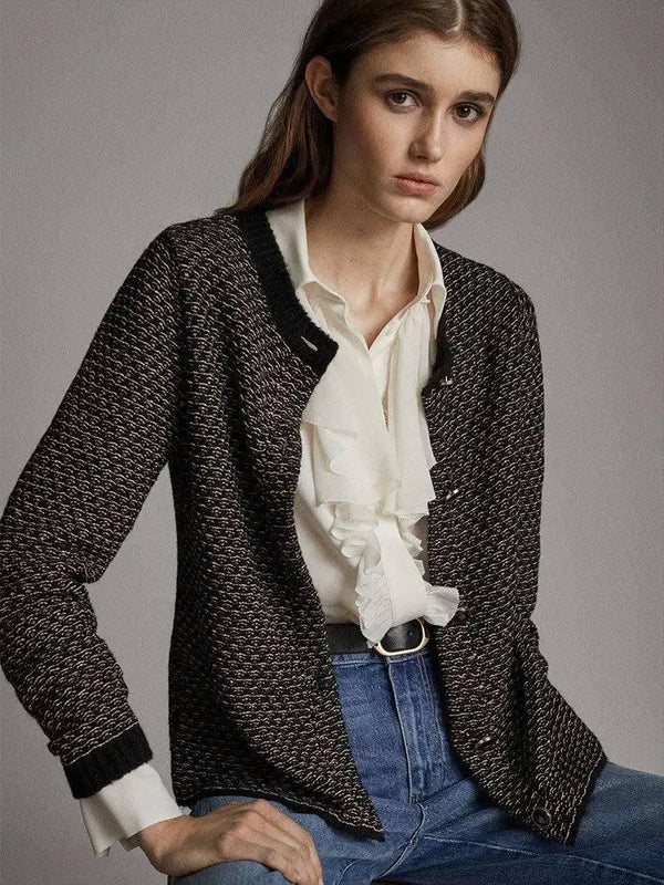 Musta kuvioitu pitkähihainen neulottu neuletakki lyhyt takki