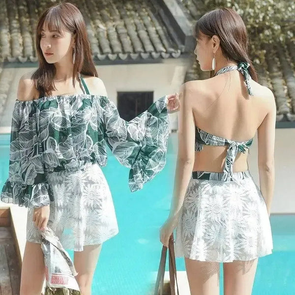 Naisten kolmiosainen uimapuku kerätty kattamaan vatsaa