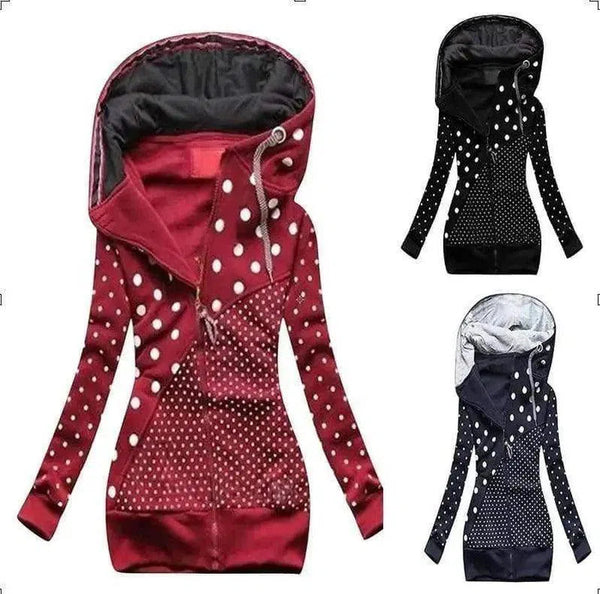 - Chic Polka Dot Hoodie: Ota vastaan leikkisä mutta tyylikäs look tämän silmäänpistävän polka dot hupparin kanssa, joka sopii täydellisesti lisäämään pop-kuvion vaatekaappiisi.