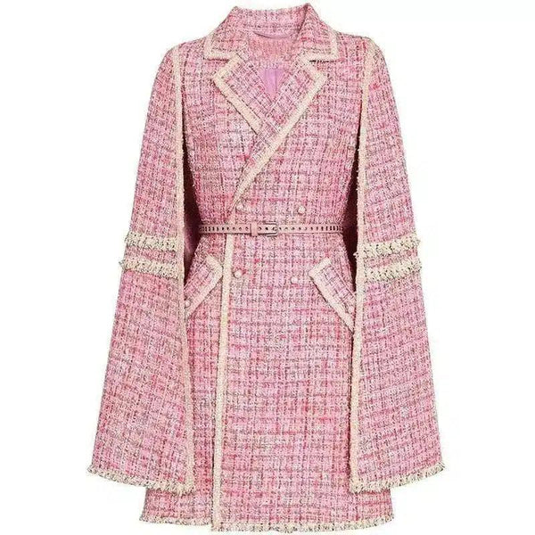 Naisten tweed vyöllinen takki hapsuilla yksityiskohtaisesti