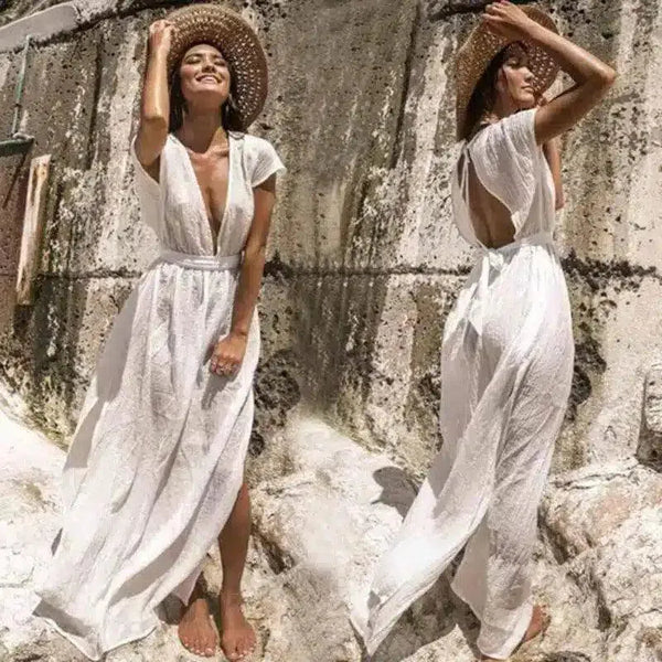 Kesä Maxi mekko V-kaula ja solmio vyötäröllä