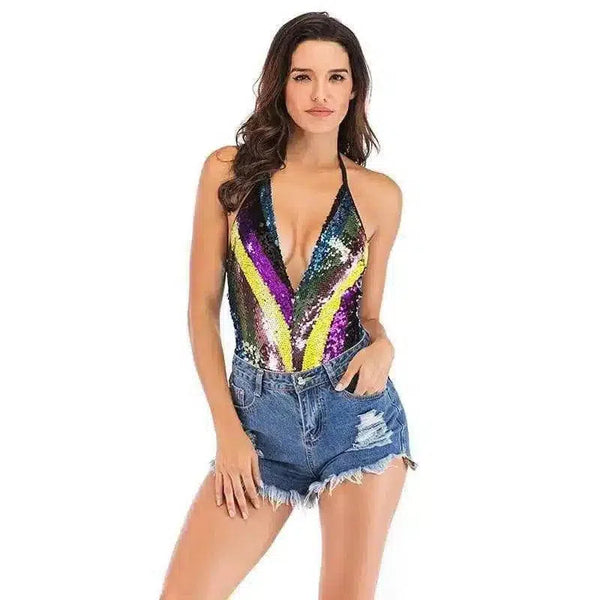 Sequin Halter Bodysuit & Ripped Denim Shortsit