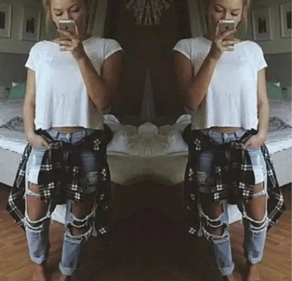 - Tyyli: Trendikkäät suorat farkut, joissa on moderni reikämalli
