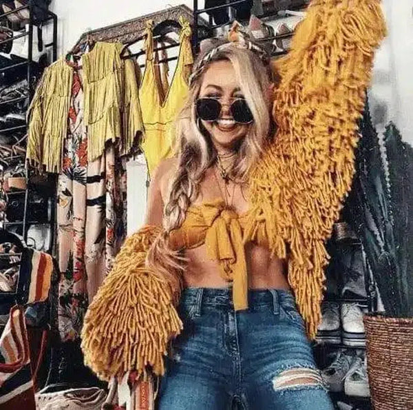 - Tyyppi: Fringed cardigan ja tie-front crop top
