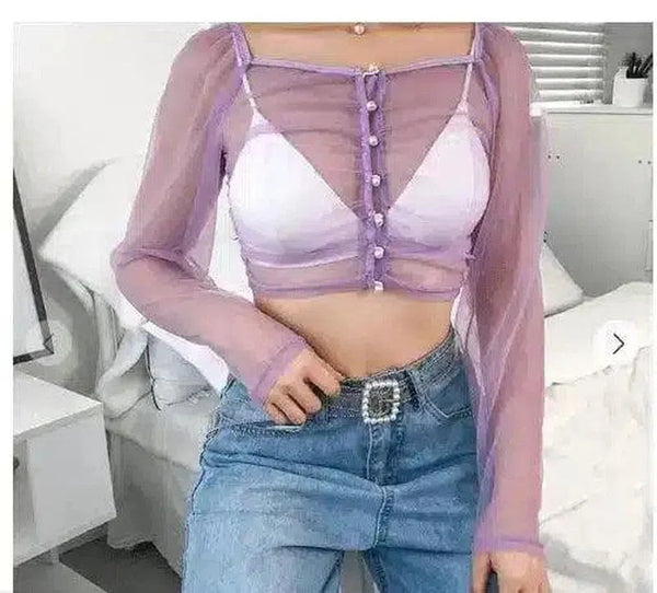 Naisten Sheer Button-Up Crop Top pitkillä hihoilla