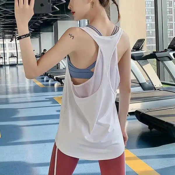 Naisten hihaton treenitankki, jossa on avoin selkäosa