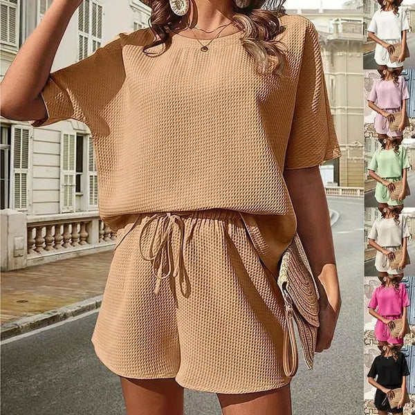 New Waffle Suit Women's Bat Sleeve Short-sleeved Crew-neck Top And Drawstring Design Shorts Fashion Two-piece Set Summer Clothing