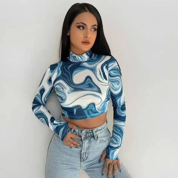 Tulostettu puoli Turtleneck Pullover Crop Finger Sleeve Top Top