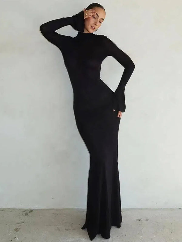 This black longsleeve backless dress features an elegant open-back design that enhances your silhouette. The dramatic trumpet sleeves add a touch of sophistication, making it a must-have for evening events.