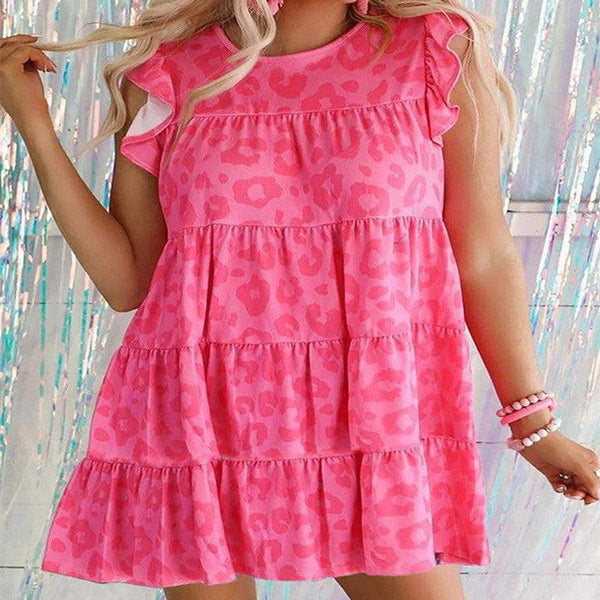 Summer Leopard Print Round Neck Ruffled Layered Mini Dress