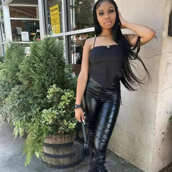 Tiukat laskostetut korkeavyötäröiset Stretch nahkahousut