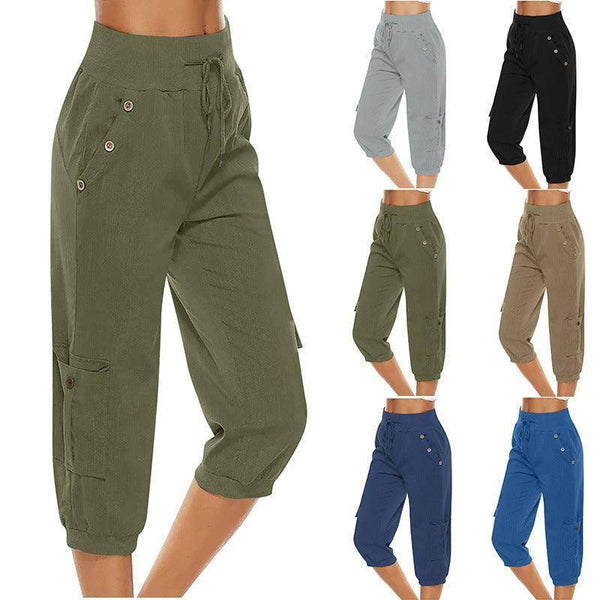 Women's Cropped Pants Cotton Linen Cargo Pocket Casual Pants Sapphire Blue / 2XL